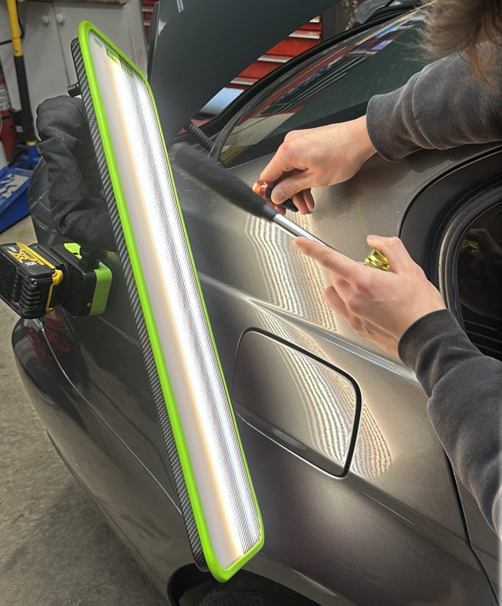 Instead of the traditional method of repairing dents on vehicles with body fillers and repainting, we use a much more effective and non-intrusive method called Paintless Dent Repair (PDR). PDR is a specialized technique which requires precision tools and great experience to gently reshape the metal from behind the panel, restoring your vehicle's original look without affecting the factory finish. This is especially beneficial as you get to keep your vehicles market value as high as possible, without a pesky CarFax report!